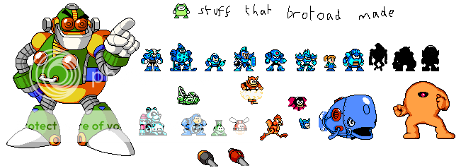 Gyro Man(Love how he came out.), Astro Man(Can anyone say really lazy skin? I can! He's not out yet.), Cloud Man(Not out yet, but Brotoad fixed him up reaaal good.), Gravity Man(Can barely be considered mine, because Cutman overhauled him.), helped with Hot Head(Seen in a couple stages, like Quick Man.)
